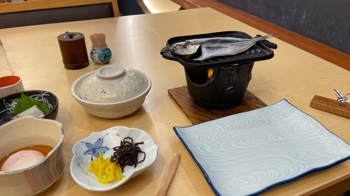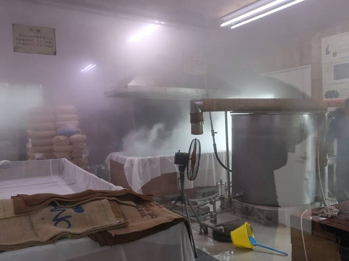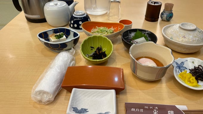 Vor der Besichtigung ist Mittagessen angesagt. Das Restaurant ist so groß, dass wir mit der ganzen Gruppe dort Platz fanden. Ich wählte etwas, das ich selber zusammenstellen durfte: ein Misoball mit Bonitoflocken mit heißem Wasser auffüllen und auflösen. Warmer Tofu, Gewürze, Sesam und pürierter frischer Knoblauch dazu, umrühren und mit Reis zusammen genießen. Erst habe ich den Reis mit Stäbchen dazu gegessen, dann bin ich zu der ökonomischen Variante übergegangen und den Reis mit dem Suppenlöffel gegessen.