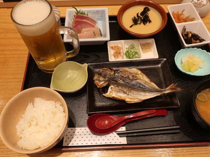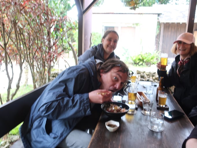Danach löste sich die Gruppe langsam auf, und wir zogen zu fünft weiter. Erstes Ziel: das Mangohaus, denn ein echtes Okinawa-Hemd musste natürlich mit! Danach bummelten wir noch durch einige Souvenirläden, bevor wir den Abend in einem Izakaya ausklingen ließen. Die Izakaya-Etikette hatten wir allerdings noch nicht ganz verinnerlicht – statt gemeinschaftlich zu bestellen, wählte jeder für sich. Aber egal, das Essen war lecker, das Bier kalt, und die Stimmung bestens.