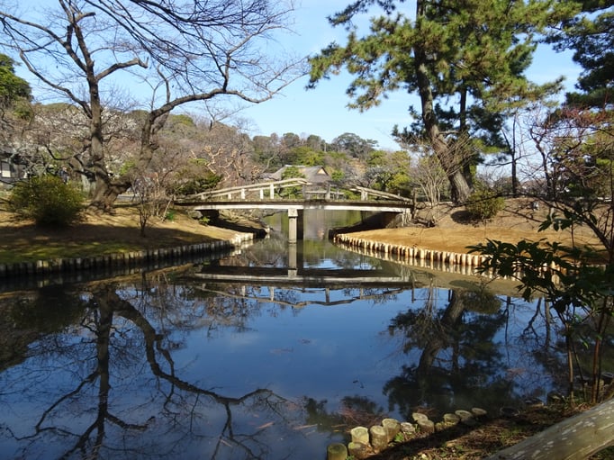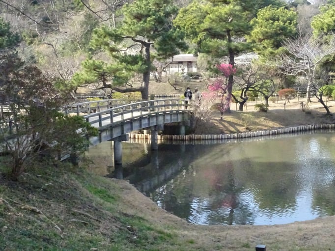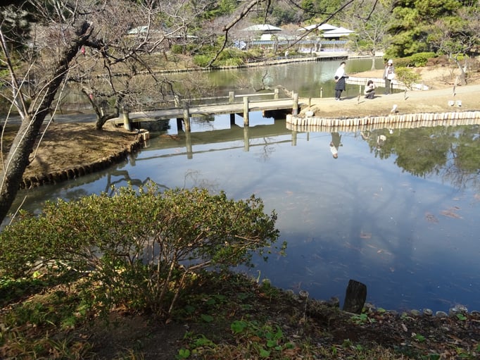 Den Palast durften wir, ohne Schuhe natürlich, betreten. Durch die geöffneten Türen/Fenster hat man einen wunderbaren Blick auf den Teich. Über den Teich führen mehrere Steinbrücken. Im Garten blühen die Pflaumenbäume, fast so schön wie die Kirschbaumblüten, aber nur fast.