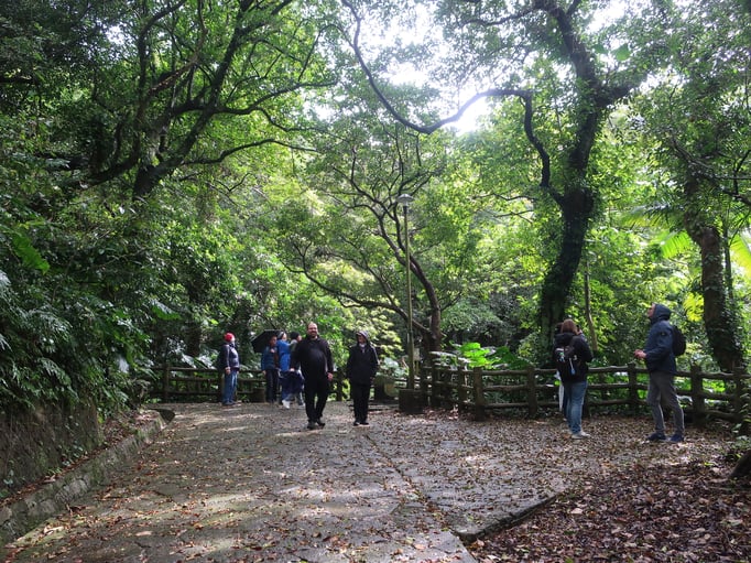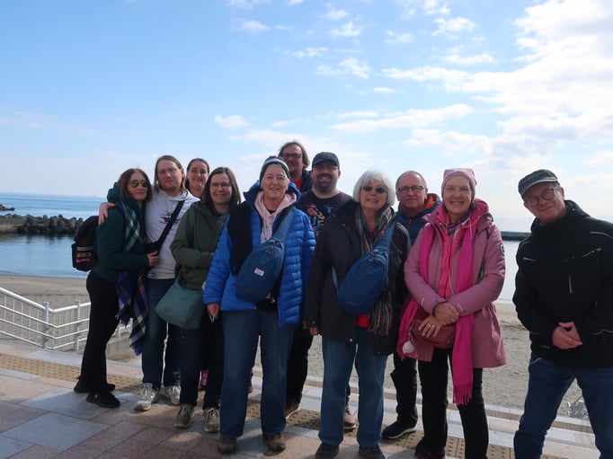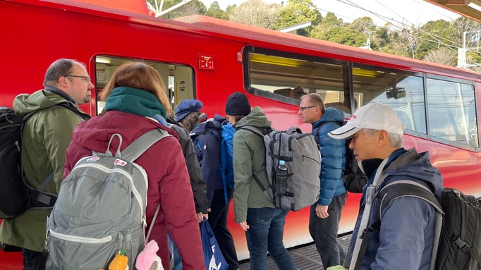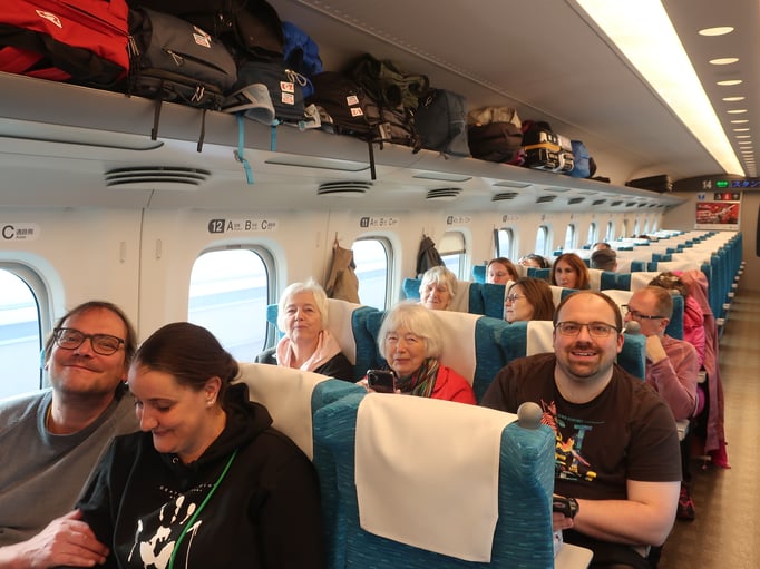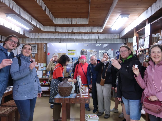 Mit im Bus sitzt eine japanische Wanderreisegruppe, ausgerüstet mit Wanderschuhen und Stöcke.