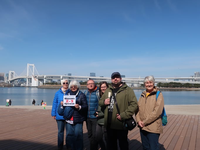 Heute haben wir uns 10 Uhr, wer wollte, getroffen. Wir sind mit der Asakusa Line und danach mit der Yurikamome Line nach Odaiba gefahren. Die Yurikamome ist eine erhöht angelegte Einschienenbahn,
