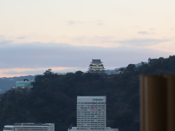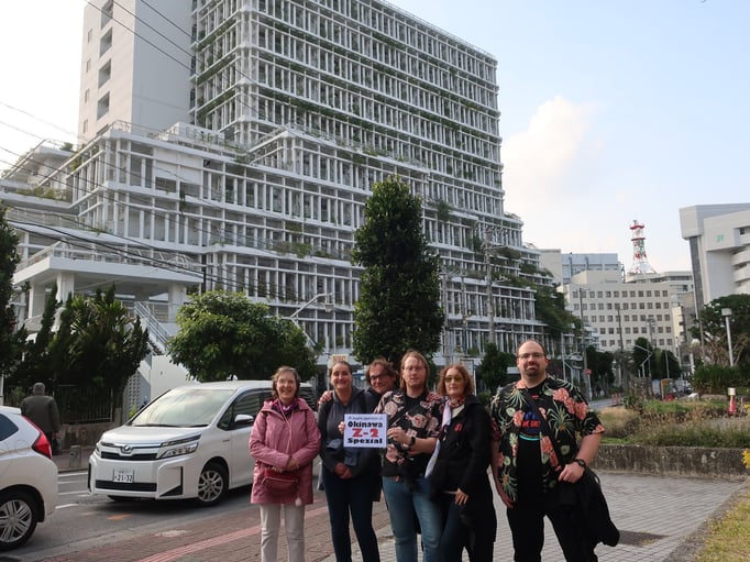 Doch lange hielten wir es dort nicht aus. Um 15:30 Uhr brachen wir mit der Gruppe zum Naha Rathaus und zur Präfekturverwaltung auf. Nach dem obligatorischen Gruppenfoto mit dem Rathaus im Rücken ging es hoch hinaus – in den 14. Stock des Verwaltungsgebäudes. Von dort hatten wir einen tollen Blick auf die Kokusaidori, den Hafen und sogar den Flughafen. Ein schöner erster Eindruck von Naha!