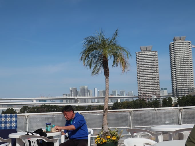 Auf der Insel angekommen spazierten wir über den Odaiba-Marine Park mit einem schön errichteten Strand, angelegt mit einer beeindruckenden Aussicht auf die Stadt. Wir gönnten uns bei Sonnenschein