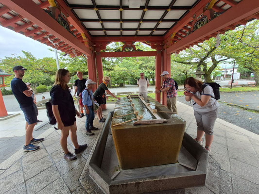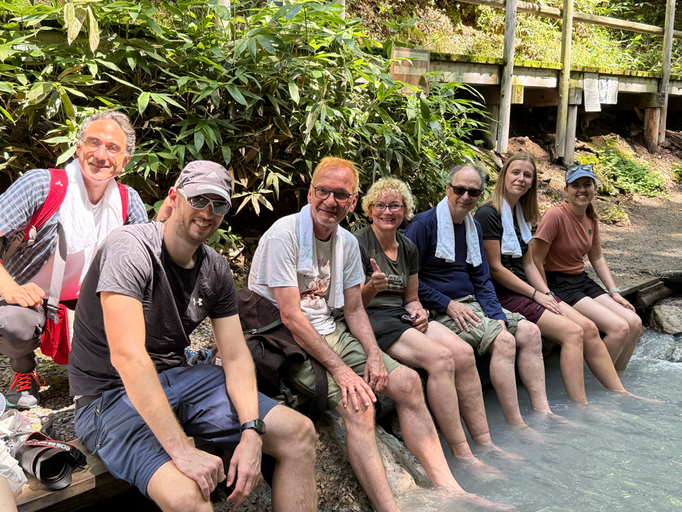 Nachdem gestrigen anstrengenden Tag (von unserer Reisegruppe wollten Sechs auf den Fuji und alle haben es geschafft) war heute Erholung angesagt. Nach einem ausgiebigen Frühstück in aller Ruhe trafen wir uns um zehn Uhr zum Besuch im naheliegenden Onsen. Für die Hinfahrt hat Koyama-San die Taxifahrt spendiert, denn es ging 30 Minuten bergauf. Mit dem Muskelkater von gestern kein Vergnügen. Aber das Bad im heißen Wasser tat sehr gut. Und die Ruhe.