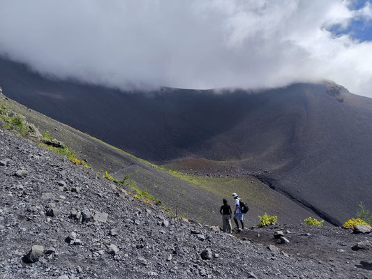 Wir sind, wie die echten Fuji Besteiger, mit dem ersten Bus um 06:35 zur Station 5 des Fujinomyia Weges gefahren. Da wir sehr früh, kurz nach 6 Uhr, an der Haltestelle waren bekamen wir gute Sitzplätze. Eine ganze Menge Leute konnten aber nicht mitfahren. Wir haben sie aber später oben wieder gesehen, es wurde also wohl ein zweiter Bus nachgeschoben. Um 07:15 waren wir oben an der 5.Station und da wir beide unsere Registrierung online gemacht hatten, war der Einlass problemlos. In etwas über einer halben Stunde stiegen wir bis zur Station 6 auf. Der Weg dorthin ist noch „zahm“ aber es gibt doch einige felsige Stellen die einen guten Eindruck von dem Weg weiter oben vermitteln. Das Wetter war gut, zu Anfang konnten wir den Gipfel einige Male kurz sehen. An der Station 6 genehmigten wir uns erst mal einen Kaffee. Hier zweigt der Weg nach rechts zum Mt.Hoei ab. Diese 6. Station hat wohl zwei Pächter. Der linke Teil war recht schmudellig und die Toilette zum davon laufen. Im rechten Teil waren die Leute freundlich und die Toilette sehr sauber. Der Weg führte nun erst mal wieder auf ca. 2400 m hinunter in den Krater des Mt.Hoe. Von hier aus steigt der Weg dann steil zum Gipfel auf. Er besteht fast ausschließlich aus rutschigem Lavagestein. Das führte an den steilen Stellen dazu daß man 3 Schritte aufstieg und zwei wieder zurück rutschte. Ich hatte zwei Stöcke mit die wir aufteilten, das erleichterte den Auf- und Abstieg doch sehr. Nach guten 1 ½ Stunden waren wir oben. Der normale Weg führt in Richtung Fujigipfel auf etwa 2720m und fällt dann nach rechts zum Gipfel des Mt.Hoei (2693m) wieder ab. Wir nahmen auf dem Hinweg aber eine Abkürzung direkt zum Gipfel. Dort legten wir eine längere Pause ein, verspeißten Bananen und sonstige Leckereien und hofften daß die Wolken aufreißen und den Blick zum Fuji nochmal freigeben würden, dem war aber nicht so. Die Zahl der Kletterer zum Mt.Hoei hält sich in Grenzen, teilweise waren wir alleine am Gipfel.