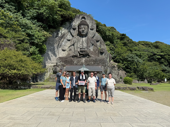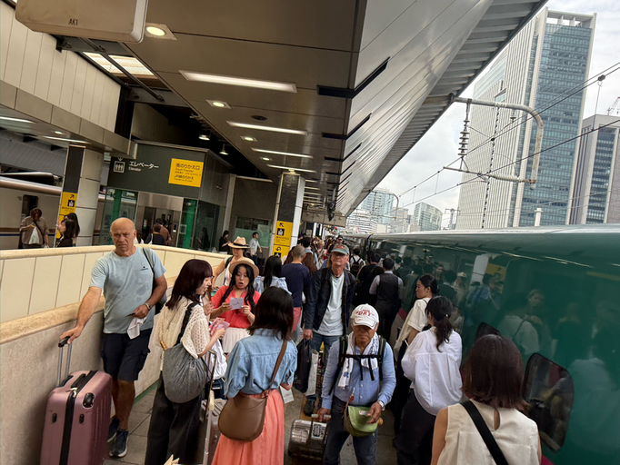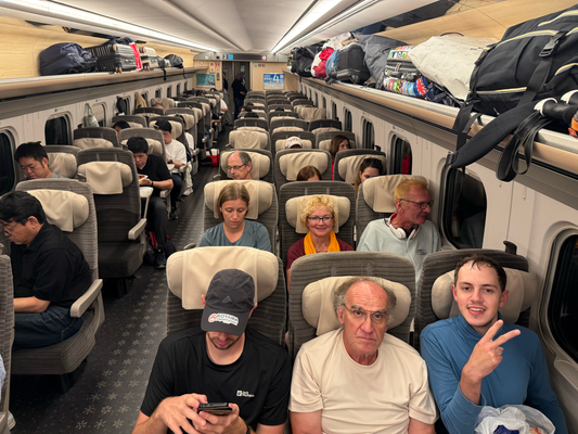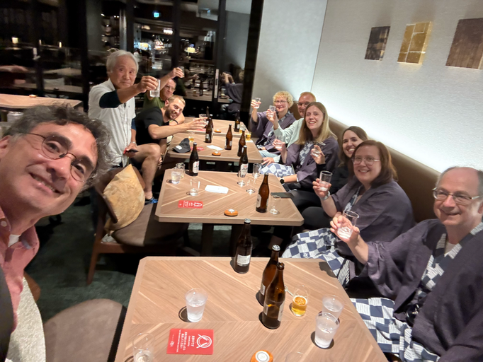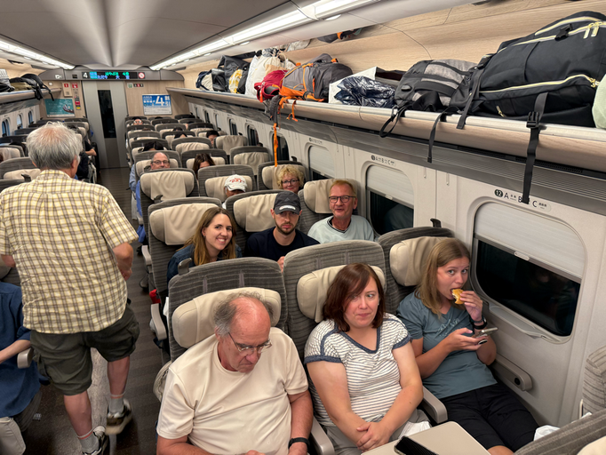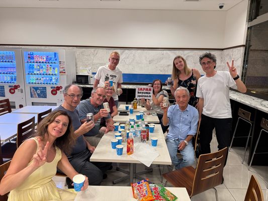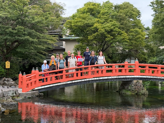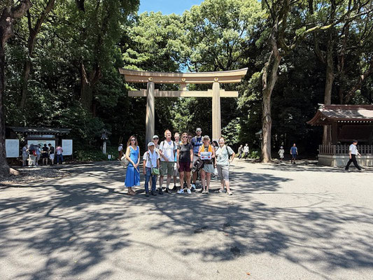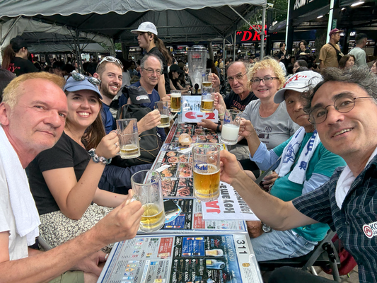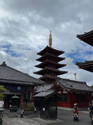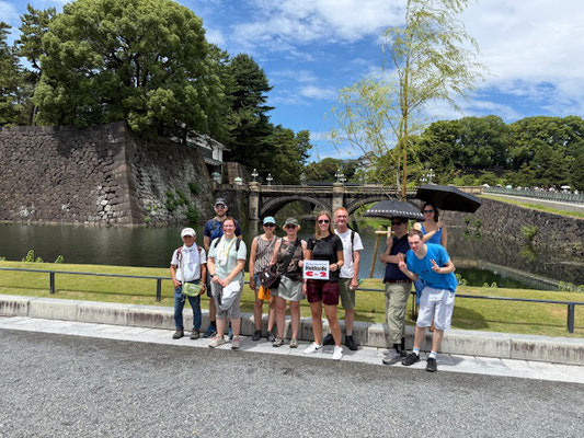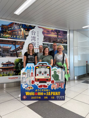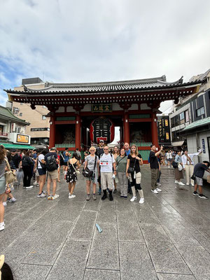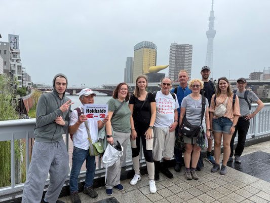 Der Gründer von Koyama Japanreisen, Shoji Koyama, war der erste am Gate 52 in Frankfurt um seine Gäste zu begrüßen. Nacheinander trudelten die Reiseteilnehmer, gemischt mit den Teilnehmern der Reise C1 ein. Viele kannten sich von von früheren Reisen, so daß viele Begrüßungen stattfanden. Pünktlich um 14 Uhr startete die alte Boeing 747-800. Der 12 Stunden Flug war teilweise etwas ruppig, der Service von Lufthansa ist gleich geblieben, spätestens ab Reihe 36 gab es nur noch ein Gericht, Nudeln, zur Auswahl. Pünktlich um 09:30 landeten wir in Tokyo Haneda. Alle unsere Koffer kamen an, was will man mehr ! Die Einreisekontrollen verliefen, mit oder ohne Visit Japan Web, sehr zügig, so daß bald alle Teinehmer in der Ankunftshalle in Haneda versammelt waren. Wer noch keine Pasmo Karte hatte konnte dies am Automaten kaufen, der Rest der Gruppe lud seine vorhandenen Karten auf. Mit der Asakusa Line ging es bis zur Haltestelle 16 Richtung Hotel. Dieses Hotel ist neu für Koyama, es funktionierte aber alles in gewohnter Toyoko Inn Qualität. Da wir unsere Zimmer erst um 16:00 Uhr beziehen konnten, machten wir erst mal Mittagspause in nahen Konbinis oder Schnellrestaurants. Um 13:00 Uhr treffen wir uns zur ersten Erkundung der Umgebung. Leider begann es nun leicht zu regnen. An der Brücke wurde das obligatorische Koyama Foto mit den Teilnehmern vor der Kulisse des Skytree und der Asahi Brauerei mit ihrem goldenen Symbol auf dem Dach gemacht. Weiter ging es zum Asakusa Tempel mit dem großen Lampion und den vielen Verkaufsständen. Vom 8. Stock des Touristen Informationszentrums konnte man sich den ganzen Komplex von oben anschauen. Nach einer Opfergabe und beten für gutes Wetter und einen unfallfreien Urlaub gab es noch einige Tips zum Einkaufen, essen gehen und abends ausgehen. Nun löste sich die Truppe auf und jeder ging seines Weges in Richtung Hotel zurück. Im Hotel erfrischten sich die Teilnehmer je nach Lust und Laune mit einem kühlen Bier von innen und einer kalten Dusche von außen.