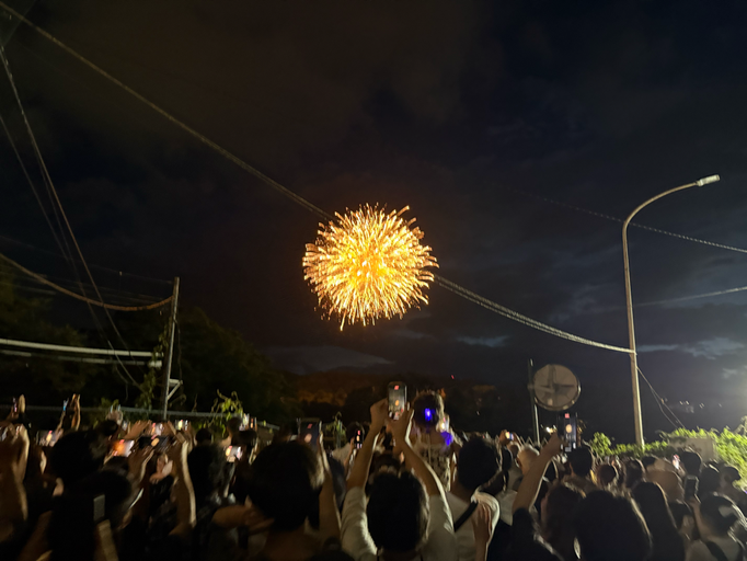 Um 18:00 trafen wir uns noch einmal vor dem Hotel um das große Feuerwerk an zu sehen. Zuerst ging es zur Fußgängerpassage für ein individuelles Abendessen. Dann weiter, mit der Anweisung von Shoji sich immer links zu halten, in Richtung Feuerwerk. Die Straßen waren aber mit einem sehr großen Aufgebot von Polizei und Ordnern abgesperrt sodaß man dieser Anweisung gar nicht folgen konnte. Man wurde lautstark immer wieder dazu genötigt nicht stehen zu bleiben sondern weiter zu gehen. Auf einer Brücke hatten ich und einige andere Teilnehmer eine optimale Stelle zur Besichtigung gefunden, aber wir wurden sehr strikt aufgefordert dort nicht stehen zu bleiben sondern immer weiter zu gehen. Der Sinn dieser Anweisungen ist keinem von uns einsichtig. So zog sich die Koyama Gruppe immer weiter auseinander und am Ende waren viele für sich alleine beim Besichtigen des Feuerwerks.