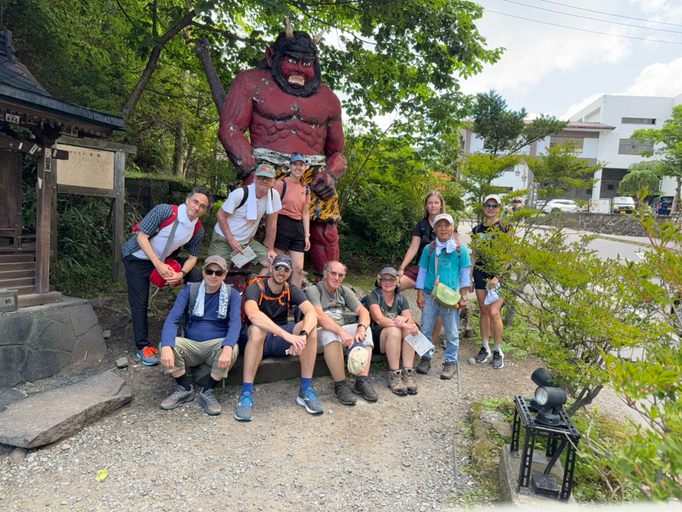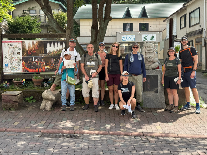 Pünktlich um 5.00 Uhr fuhren wir mit dem Taxi los. Auf der knapp einstündigen Fahrt herrschte angespanntens Schweigen, jeder hing seinen Gedanken nach und alles in allem waren wir aufgeregt wegen der bevorstehenden Bergbesteigung. Schnell noch einen kostenlosen Toilettengang (auf den einzelnen Stationen kostet es 300 Yen) und los gings! Obwohl ich auf das Gruppenfoto verzichtete und schon los bin, wurde ich nach und nach von allen Mitstreitern überholt. Naja. Ich brauchte wesentlich länger als alle Anderen, aber ich habe es geschafft. Leider habe ich die Zeit für den Rückweg unterschätzt und der letzte Bus war weg. Also unbedingt den Anweisungen in Koyamas Reiseplan folgen und spätestens 14.00 Uhr den Abstieg beginnen.