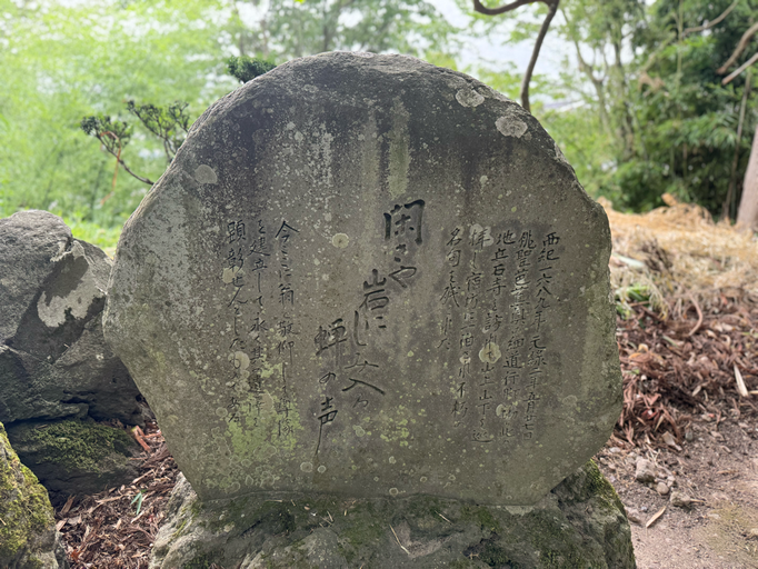 Die Treppen sind in einzelne Abschnitte unterteilt die zu Figuren oder Tempelbauten führen. Diese ungewöhnliche Lage an den steilen Berghängen sowie die Einbettung in die umliegende Natur inspirierte den bekannten Dichter Matsuo Basho, eines seiner berühmtesten Haiku Gedichte zu verfassen. Suche die Stille, lausche dem Gesang der Zikaden und versinke in den Felsen. Der Text dieses Gedichtes ist dort auf einem Stein zu finden.