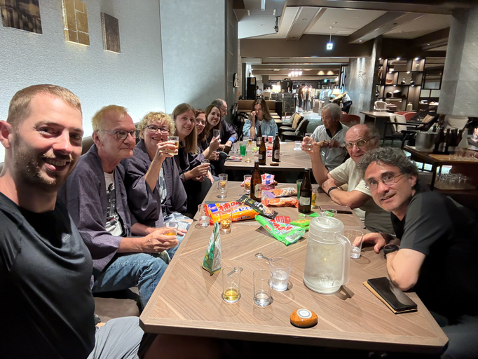 Nach einer kurzen Verschnaufpause im Hotel und einem kleinen Bummel durch die Einkaufsstraße beschlossen wir, den Abend entspannt ausklingen zu lassen. Dieses Mal landeten wir – in etwas größerer Runde – wieder in der Lobby, diesmal mit Gyoza zum Mitnehmen und dem ein oder anderen Getränk.