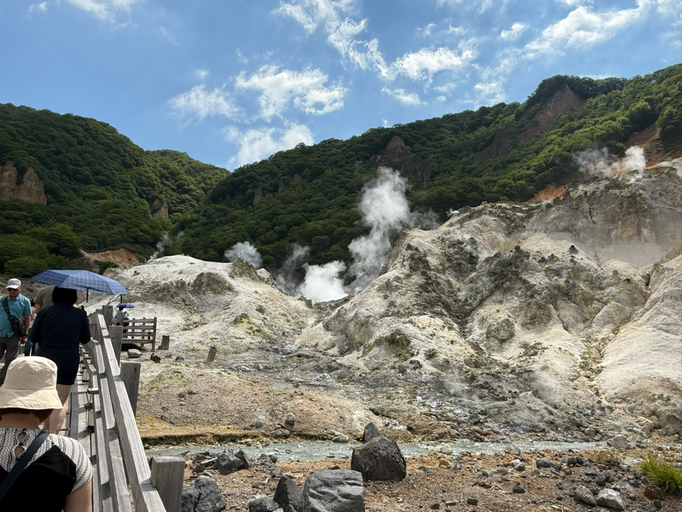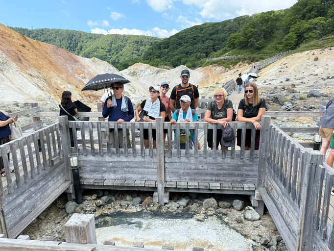 Heute findet ein interessanter Ausflug ins „Höllental“ (Jigokudani) statt. Das Toyoko Inn in Tomakomai ist wesentlich kleiner als das letzte Hotel in Sapporo und so findet das Frühstück ohne Platzprobleme, fast gemütlich statt. Danach geht es aber zügig zum Bahnhof um den Zug um 7:40 nach Noboribetsu zu erreichen. Um ½ 9 waren wir dort und es ging weiter mit dem Bus nach Noboribetsu-Onsen. „betsu“ bedeutet Fluß in der Ainu Sprache. Wie wir gestern im Ainu Museum gelernt haben, lebten die Ainus früher in dieser Gegend. An der Bushaltestelle gibt es ein neues Gebäude und beim Einstieg zum Bus ist auch alles „neu“. Koyama San war mit dem Ablauf gar nicht zufrieden. Man konnte an dieser Station noch kein Ticket am Automaten kaufen sondern muß im Bus in der Mitte einsteigen und eine Nummer ziehen. Beim Aussteigen präsentiert man dem Fahrer diese Nummer und zahlt (450 Yen) passend in bar. Darauf waren aber nicht alle Reisende, besonders unsere chinesischen Freunde, eingestellt und so dauerte es fast 10 Minuten bis der letzte Koyamaner aussteigen konnte. Von der Bushalltestelle ging es etwa 2 KM aufwärts bis zum Eingang des Höllentals. Auf Rundwegen mal auf mal ab umrundeten wir das Tal. Überall tritt Dampf in einer vegetationslosen Umgebung aus. Dicht daneben ist aber grüner Urwald, ein seltsamer aber schöner Kontrast. Oberster Punkt des Weges war der Oyunuma See mit seinem etwa 50°C heißem Wasser. Von dort ging es weiter, dem Bachlauf entlang, zu einer Stelle in der die Füße im +/- 37°C warmem Wasser gebadet werden konnten. Dank Koyamas Reiseplanung kamen wir hier so früh an, daß fast jeder diese Gelegenheit nutzen konnte. Nun ging es zurück nach Noborobetsu-Onsen. Hier teilte sich die Gruppe auf, einige fuhren direkt zurück, einige gingen in einen Nobel Onsen und einige wollten zu Bärenpark.