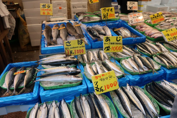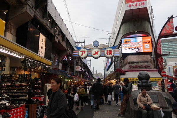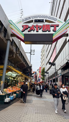 Dann ging es nach Ginza, wo Koyama-san einige Geschichten zum besten gab. Nachdem jeder für sich den Stadtteil erkunden konnte (hier gab es zwischen Prada und Uniqlo alles, kleine Cafés, Konbinis, Kimonoschneidereien, etc.), trafen wir uns am Löwen vor dem Mitsukoshi Ginza Palace wieder. Nun ging es per Bahn nach Ueno und dort zum Ameyoko-Markt. Dort hieß es deutlich: „nichts kaufen, nur gucken!“. Zu sehen gab es aber auch Unmengen: von Obst über allerhand getrocknete, frische oder gebratene Fische, Hühnchenteile, Krabben, Fleisch, dazwischen kleine Seitenrestaurants im Izakaya-Flair sowie massig (gefälschte? Man munkelt noch 🤭) Kleidung, Handtaschen, Parfüms.