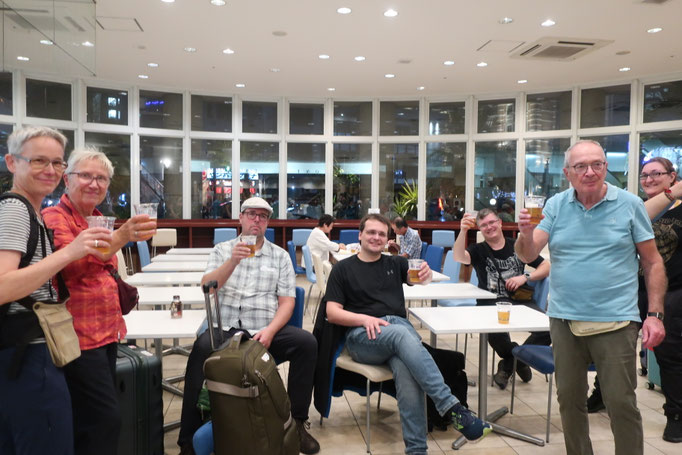 Offenbar bin ich tatsächlich der erste unserer Reisegruppe, der den Zoll passiert hat und so warte ich mit ihm gemeinsam, auf die anderen Teilnehmer. Ich nutze die kurze Wartezeit damit, dass ich eben schnell am Automaten mir mein japanisches Geld zum aktuellen Kurs ziehe (plus Bearbeitungsgebühr von 220 Yen ~1,3 Euro?) und eine Travel-SIM-Karte besorge. Als dann alle Teilnehmer versammelt sind, erklärt Koyama-San die ersten Vorgänge in Japan und besorgt mit all denjenigen, die noch keine IC-Karte („PASMO“) haben eine solch wiederaufladbare Fahrkarte. Da ich meine ICOCA-Karte aus dem Jahr 2018 noch immer nutze, warte ich solange am Gepäck, damit das keiner ständig mit sich herumschleifen muss. Sind nun alle Mobil? Gut! Dann auf zur U-/S-Bahnstation. Da wir nun circa 50 Minuten Bahnfahren werden, stellt Koyama-San die übliche Frage, ob noch jemand „Hände waschen“ muss (Euphemismus für Toilettengang). Die Fahrt vom Flughafen zu unserer Station Kuramae A17 vergeht rasch beim Betrachten des Stadtbildes durch das Fenster oder bei gedämpft geführten Gesprächen. In Kuramae angekommen verlassen wir den Bahnhof, überqueren eine Straße und stehen schon vor dem Hotel; kürzere Laufwege kann man sich kaum wünschen.