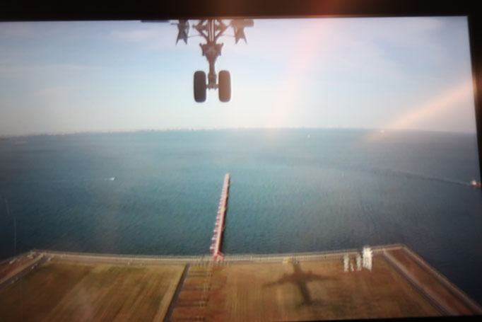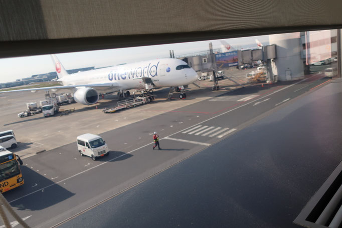 Die Stunden vergehen wie im Flug – Wortwitz gewollt –: die kleinen Erfrischungen, Snacks, das „Mittagsmenü“ (Hähnchenschnitzel auf Reis oder Gnocchi in Spinatsauce) sowie das umfangreise Programm an Filmen, Serien Spielen oder auch Meditationsklängen lassen kaum Langeweile aufkommen. Mein Sitznachbar ist auf dieser Reise ungewöhnlich schweigsam, zieht schnell seine Schlafmaske auf und versucht den Flug auf diese Weise zu verkürzen. Ich habe ihn vor der Ankunft gefragt: Auch er kriegt im Flieger keinen Moment Schlaf rein. Kurz vor der Ankunft verteilen die Stewardessen und Stewards warme feuchte Tücher, um Gesicht und Hände zu reinigen und erfrischen… und kurz darauf das Frühstück bestehend aus dem üblichen Minibrötchen, Rührei mit Tomaten-Gemüse-Sauce und Joghurt. Ich bin so vertieft in meine Lektüre, dass ich fast den Anflug in Haneda verpasse und nur das „Unruhig werden“ der übrigen Fluggäste lässt mich die letzten Momente noch mitbekommen. Gewöhne ich mich etwa so langsam an die Fliegerei oder ist das nur ein Merkmal dieses sehr ruhigen Fluges? Im Nachhinein muss ich wirklich sagen, dass wir bis auf wenige kleine Ruckler keine Turbulenzen hatten; ganz anders als beim letzten Anflug in Tokio im März diesen Jahres, als die Maschine von Regenwällen und Seitenwinden geprügelt in Haneda herunterkam. Heute empfängt uns ein lammfrommer, Wolken verhangener Himmel mit nur leichtem Seitenwind. Da wir im Flugzeug im hinteren Teil untergebracht sind, kommen wir natürlich auch als letzte heraus; scheinbar habe ich den Flug aber doch besser überstanden als angenommen. Auf meinem Weg vom Gate zur Halle mit den Sicherheitskontrollen und Zollschaltern überhole ich frischen Schrittes einen Großteil der übrigen Flugreisenden.
