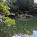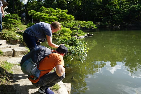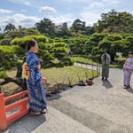 Zum Abschluss des Aufenthalts in Takamatsu stand bei strahlendem Sonnenschein und ein paar dekorativen kleinen Wölkchen der Besuch des Ritsurin-Parks auf dem Plan. Nach einem dreißigminütigen Spaziergang erreichten wir den 75 ha großen Landschaftsgarten, dessen Aufbau 100 Jahre in Anspruch nahm und 1745 vollendet war. Er zählt zu den berühmtesten historischen Gärten Japans.
