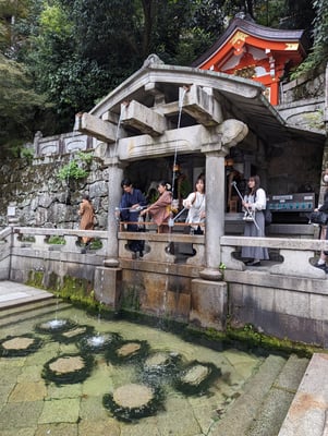 Neuer Tag selbes Spiel- wir trafen uns um 7:50 Uhr am Hoteleingang und machten uns mit der Bahn auf den Weg nach Kyoto, da noch einige Programmpunkte auf uns warteten. Routiniert managten wir das Ein-, Um- und Aussteigen und kamen schließlich am Ginkakuji, dem Silberpavillon an. Jeder konnte wie üblich im eigenen Tempo den Zen-Tempel mit Sandflächen und Sandkegel sowie die Aussichtspunkte im Park erkunden. Im Anschluss ging es zu Fuß weiter zum 2 km langen Philosophenweg. Der Weg verläuft entlang eines Baches und ist an den Rändern mit Kirschbäumen umsäumt. Auch ohne Kirschblüte war der Spaziergang auf dem Weg mit den abwechslungsreichen Läden, kleinen Cafés und netten Japanern sehr schön. Wir trafen z.B. auf einen Mann, der aus Blättern und Blüten kleine Boote baute. Ich durfte eines seiner Boote von der Brücke ins Wasser segeln lassen. Es landete glücklicherweise mit der richtigen Seite im Wasser und schwamm auf dem Bach davon. Außerdem trafen wir auf einen Maler und einen Einheimischen, der es sich mit seiner Katze gut gehen ließ.