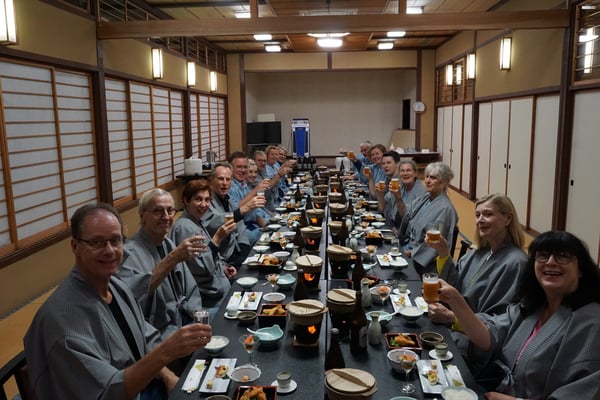 Punkt 18 Uhr sollten wir uns zum Abendessen in dem Essraum mit langem Tisch einfinden. Auf dem Tisch standen bereits kleine Schälchen und Teller mit leckeren und farbenfrohen Speisen. In einem Tontopf fanden wir rohes Gemüse mit verschiedenen Pilzen und Entenfleisch, das ganze auf einem Rechaud mit Brennpaste. Die freundlichen Damen zündeten alle Töpfe für uns an und Andreas erklärte uns, sobald die Brennpaste verbrannt ist, kann die Speise gegessen werden. Weiterhin bemerkenswert war, es kamen immer wieder neue Schalen und Teller mit leckerem Essen. Alles was sehr gut, wir waren begeistert. Dazu tranken wir warmen Sake, Bier oder auch Tee. Der Abschluss bildet dann immer die Miso-Suppe - so haben wir das von Andreas gelernt - und dann noch ein paar Stücke Nashi-Birne in Wein eingelegt.