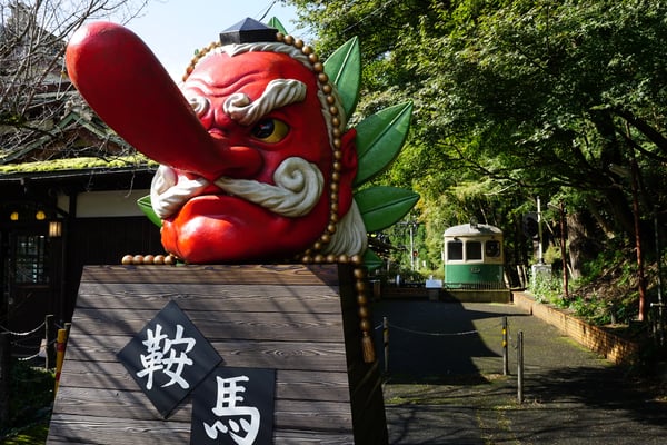 Wieder Wechsel zu einer anderer Bahngesellschaft, diesmal zur Eiden (Eizandensha). Mit einer kleinen gemütlichen Bahn ging es dann zur Endstation Kurama. Hier wird man am Bahnhof schon von einer riesigen Tengumaske begrüßt. Nach kurzem Orientieren fand ich den Eingang zum Tempel gleich um die Ecke. Ich wusste ja schon das auf den Berg eine Seilbahn fährt, aber nicht das Diese sich im Tempelgelände befindet und auch von den Mönchen betrieben wird.