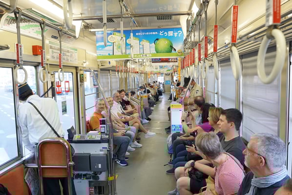 Pünktlich 8:30 Uhr ging es heute mit dem leichten Gepäck vom Hotel zum Bahnhof, um den ersten von drei Zügen auf unserer Reise nach Takamatsu zu erwischen. Die Wagons waren gut gefüllt, da die Japaner aufgrund des morgigen "Tag des Sports" (Feiertag) ein langes Wochenende haben.