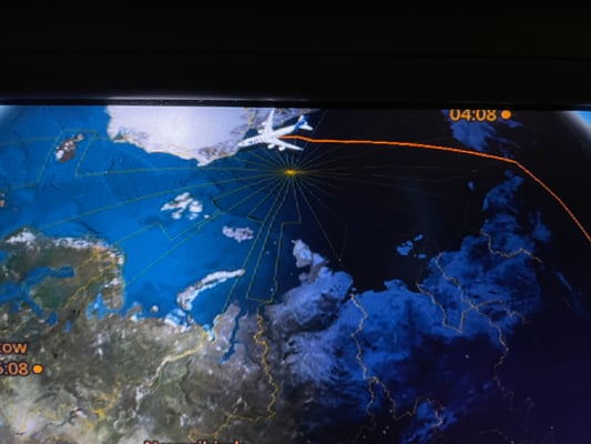 Ab den Aleuten und Alaska wurde es dann ruhiger und man konnte den Flug genießen. Zwischenzeitlich waren sogar mal Polarlichter zu sehen. Als wir Grönland erreichten begann es etwas hektisch zu werden. Viele versuchten ein paar Bilder zu machen, denn wann kommt man schon mal in die Nähe des Nordpols.