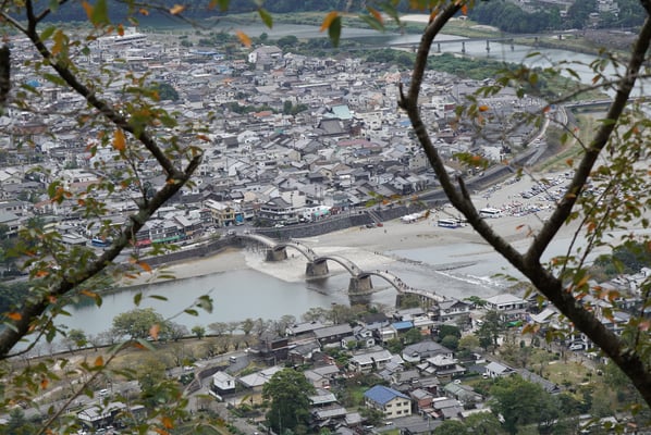 Um kurz nach 8:00 machte ich mich auf den Weg zur Hiroshima Station. Der Zug war leicht zu finden, da wir erst zwei Tage zuvor damit nach Miyajima gefahren sind. Diesmal blieb ich nach dem Halt in Miyajimaguchi einfach sitzen und fuhr weiter bis zur Endstation Iwakuni. Den Bus zur Kintaikyo war auch schnell gefunden und nach 25 Minuten konnte ich sie endlich sehen…