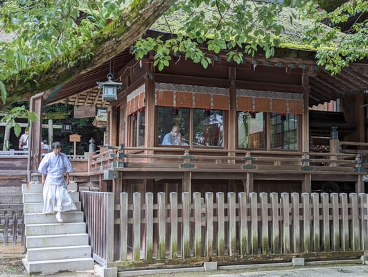 Der Kifune-Schrein ist berühmt für die Treppe mit den Laternen. Davon gibt es sehr viele Bilder und das war auch ein Grund mit, warum ich ihn mir anschauen wollte. Es war inzwischen nach 12 und da es Sonntag ist waren sehr viele Besucher unterwegs. Ich hatte aber Glück und konnte schnell ein Foto von der Treppe machen bevor sie wieder voll war. Ein Hochzeitspaar war auch unterwegs für ein Fotoshooting und ein beliebtes Fotomotiv. Nach dem Kauf von Omamori schaute ich mir noch den Hauptschrein am Ende der Strasse an und machte mich langsam auf den Rückweg. Vorbei an vielen Lokalen, deren Gastbereich über den kleinen Bach lag. Im Sommer sicher angenehm, da das Wasser kühlt. Jetzt Mitte Oktober war es schon etwas frisch. Es gab in den Lokalen Kaiseki (japanische Menus) die schon preislich etwas höher liegen wie sonst. In Begleitung wäre das sicher interessant, aber da ich allein unterwegs war sparte ich mir die Yen lieber. Ich werde bestimmt nochmal hier her kommen und dann auch das Essen probieren.