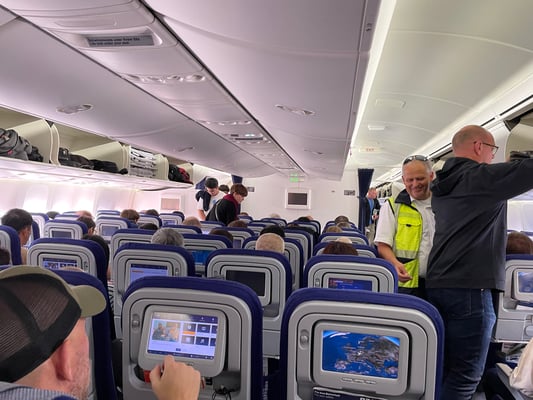 Dadurch kam dann das zweite Problem zustande… ein Passagier fühlte sich nicht mehr in der Lage die Reise anzutreten und verließ das Flugzeug. Sicherheitsvorschriften besagen, das dann auch sein Gepäck wieder ausgeladen werden muss. Also nochmal Wartezeit in der Hitze bis die richtigen Gepäckstücke gefunden und ausgeladen wurden. Mit 75 Minuten Verspätung und dank der laufenden Hauptturbinen funktionierenden Klimaanlage hob dann die Maschine endlich in Richtung Tokyo ab.