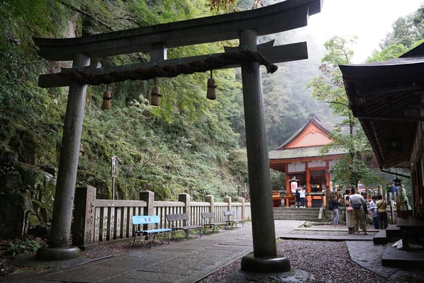 Am Ende der Anlage gibt es einen Weg in den Wald den Berg hinauf, der auch auf die andere Seite zum Kifune Schrein führt. Viele Treppenstufen aus Granit und Holz und man fand sich mitten im Wald wie in einer anderen Welt wieder. Nachts hatte es geregnet und durch die Sonne verdampfte das Wasser jetzt langsam zwischen den Bäumen. Wirklich eine sehr beeindruckende Atmosphäre. Der Abstieg auf der anderen Seite war dann schon eine Herausforderung. Am Ende des Weges kurz vor der Straße zum Kifune Schrein befand sich dann zu meiner Verwunderung wieder ein Tickethäuschen für den Kuramadera. Jetzt wurde mir erst bewusst, das der ganze Berg eigentlich der Tempel ist.