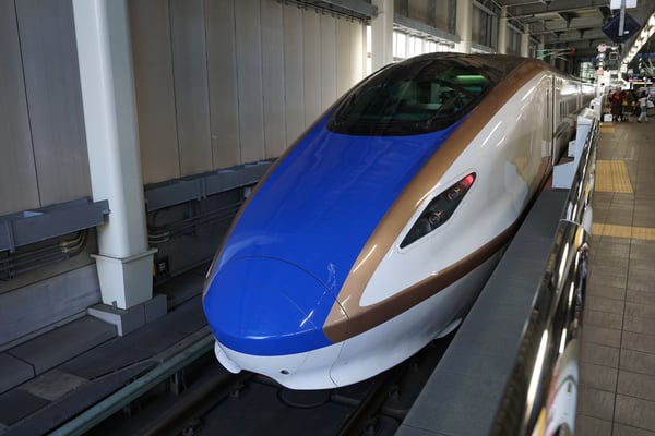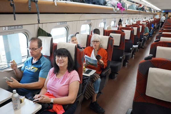 Treffen um 7:50 Uhr vor dem Hotel, dann nach Umeda zum großen Bahnhof. Dort stiegen wir in den Thunderbirds Zug (er hat eine außergewöhnliche Lokomotive-Form) und fuhren bis nach Kanazawa. Dort konnten wir uns auf unsere erste Fahrt mit einem Shinkansen Zug freuen. Mit dem Hakutaka 562 fuhren wir mit einer Höchstgeschwindigkeit von 255 km/h nach Nagano. Dann noch ein kleines Stück mit dem Asama 618 nach Ueda, wo uns der Hotelbus am Bahnhof abholte und ins japanische Hotel Fujiya brachte.
