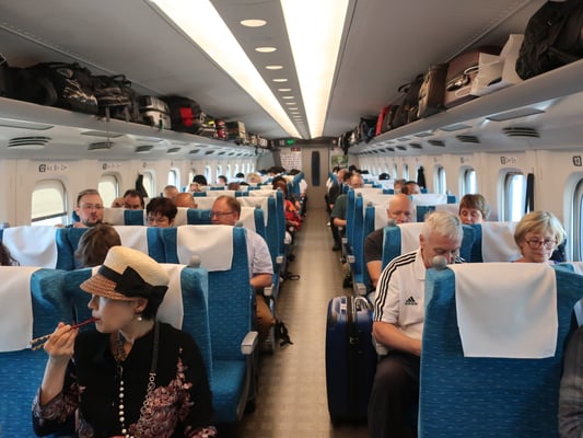Dann Shinkansen, zwei Fahrkarten, eine für die Strecke und eine für die Sitzplatzreservierung. Anders geht es nicht, da man nie weiß wieviele Leute gerade mitfahren wollen. Wie immer kommt der Zug quasi auf die Sekunde, man kann den Waggon und den Sitzplatz vorher genau ablesen an den entsprechenden Hinweisen.