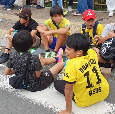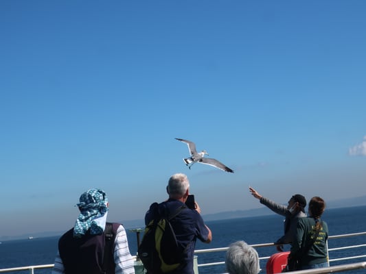 Am Terminal kaufen wir Dank Koyamasan in Windeseile die Fähren-Tickets. Nur Bares ist Wahres. Über Terminal 4 besteigen wir die Fähre, die auch von arbeitenden japanischen Kleingruppen genutzt wird. Sie sitzen gemeinsam bei ihren ersten Arbeitsmeetings, besprechen wichtige Themen, prüfen ihre Informationen auf den Smartphones und commiten sich. Die Überfahrt dauert ca. 20 Minuten. Mit Musik aus dem Lautsprecher wurden wir in Ioujima empfangen. Mit einem letzten Blick auf den Katamaran gehen wir zum Ark Land Spa an der Straße entlang. Keine Touristen und kaum Japaner:innen - ein echter Koyama-Geheimtipp.
