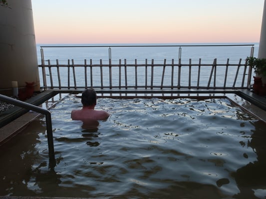 Umkleidekabinen. Nach dem Umkleiden bzw. Auskleiden erkunden wir das Onsen. Zwei schöne, mit natürlichem Stein gemauerte Becken im Außenbereich. Ein Größeres mit Sonnenschutzdach und ein