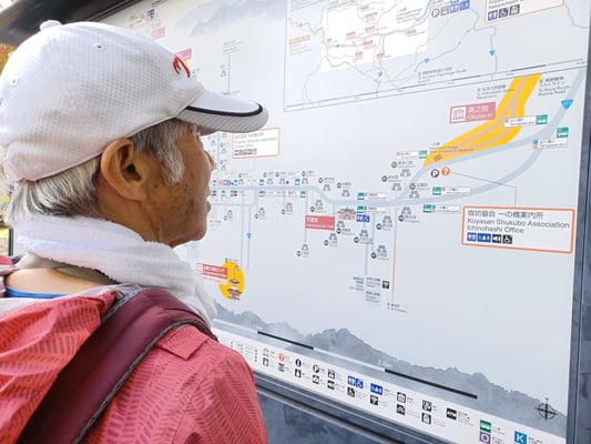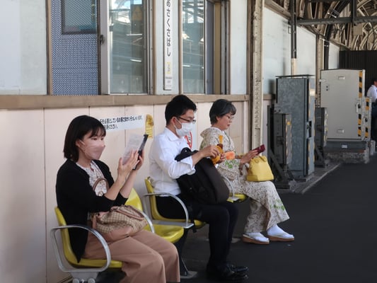 Willkommene Fotomotive am Morgen. Als die Bahn kommt, steigen viele Menschen aus und wir ein. Voll ist es, aber Platzangst muss niemand bekommen. Nach einer Station steigen wir in Umeda um in die U-Bahn Richtung Namba. Nach dem Motto: Die Letzten werden die Ersten sein, lassen wir die erste Bahn passieren und steigen als erste in die volle Bahn. Der Berufsverkehr hat uns voll erwischt. In Namba geht es weiter mit dem Zug nach Koyasan. Beim Umsteigen in die Bergbahn verpasse ich die Bahn und muss gefühlt unendlich lange warten, um mit der Gruppe aufzuschließen. Als sich die nächste Menschenmenge aus dem Zug ergießt, geht es für mich weiter. Oben erwartet mich die Gruppe am Bus-"Bahnhöfchen" wo es für alle endlich weiter geht.