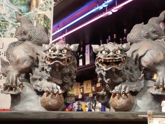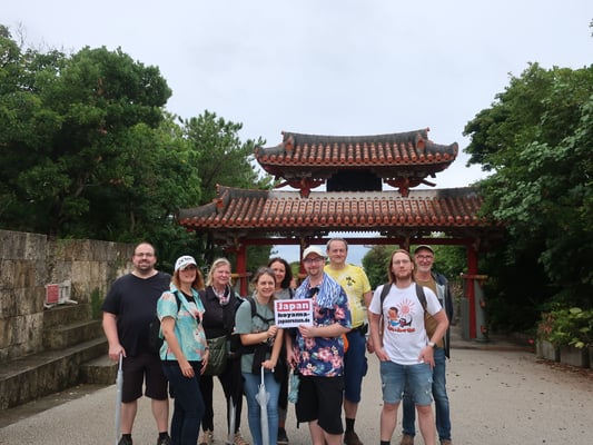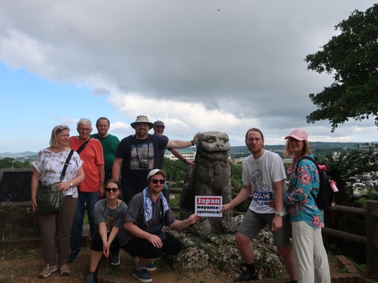 Eine kurze Verschnaufpause am Schrein und ein Selfie unserer Minigruppe, dann ging es steil den Berg hinunter zur Einschienenbahn. Unterwegs betrachteten wir die Shisa-Löwenfiguren an den Hauseingängen, die die Bewohner vor bösen Geistern und ihre Häuser vor Unheil schützen sollen. Zurück in der Innenstadt von Naha, wollten wir im Rathaus zu Mittag essen. Leider hatte die Kantine geschlossen. Zum Glück kann man sich in Japan an fast jeder Ecke mit Köstlichkeiten versorgen. Heute Mittag gab es für uns einen Okinawa-Ramen im RYOBO.
