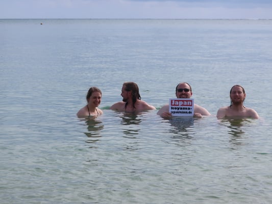 Nach kurzer Erklärung zum richtigen Verhalten im japanischen Bad (Onsen) durch Koyama-San, haben wir zur Einstimmung einen Spaziergang direkt am Meer an Palmen entlang vor der Hoteltür unternommen und die Abkühlung dank Füßen im Wasser genossen.