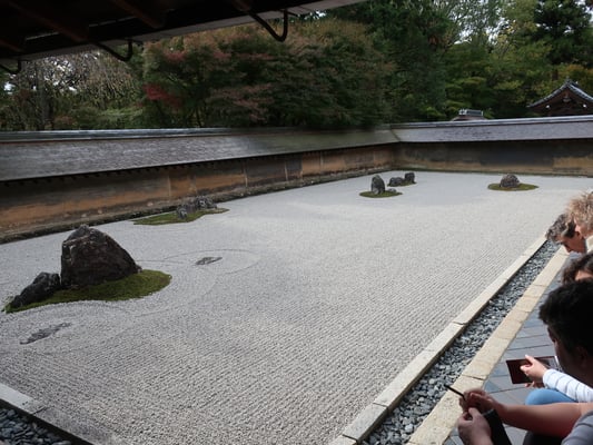 im Ryoanji-Tempel, noch übertroffen wurde. Hier kamen wir nach einem halbstündigen Fußmarsch an. Die Meditation im Zen-Garten gestaltete sich allerdings schwierig, einmal wegen der