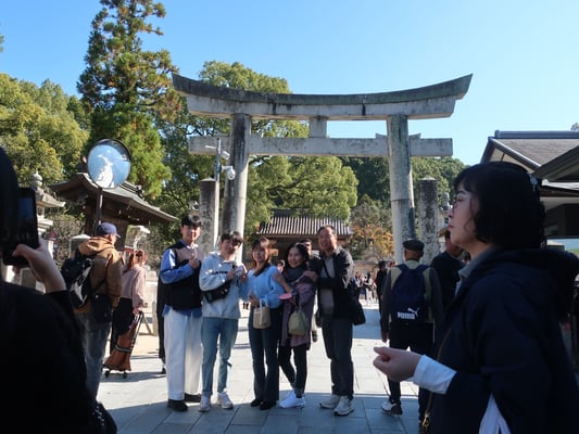 Heute sind wir mit dem Zug nach Dazaifu gefahren. Durch den Berufsverkehr hatten wir zwischenzeitlich einen Mitreisenden verloren, beim Umsteigen waren wir aber glücklicherweise wieder vollzählig! In Dazaifu angekommen schlenderten wir die bunte Einkaufsmeile entlang (schon mit den ersten Seitenblicken auf die leckeren Mochis) bis zum Schrein Tenman-gū. Die Anlage ist sehr schön, mit vielen alten riesigen Bäumen, Brücken und Wasserbecken und war anfangs auch noch nicht überfüllt. Gut dass wir so zeitig vor Ort waren! Nach einer kurzen Wanderung auf den Hügel hat ein Teil der Gruppe in einem Restaurant im Wald sehr gut gegessen (Udonsuppe, Reisdon mit Hühnchen & Ei, Mochi)! Auf dem Rückweg konnten wir den Souvenirs in den Läden nicht so ganz widerstehen und machten uns mit diversen bunten kleinen Souvenirs per Bus auf den Weg nach Hakata. Nachmittags war dann Freizeit🙂 Wir waren auf dem Weihnachtsmarkt und haben uns da mit Glühwein, Bier und Livemusik auf die Adventszeit eingestimmt - ziemlich früh dran die Japaner… anschließend ging es nochmal nach Canal City. Nach sehr gutem Streetfood und ein paar Runden Mario Kart in der Taito Station waren wir dann reif fürs Bett!