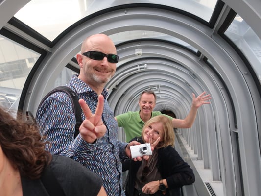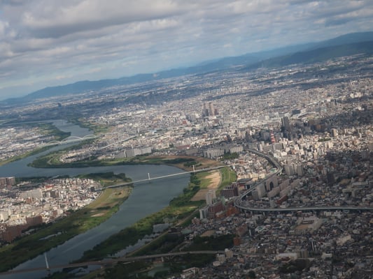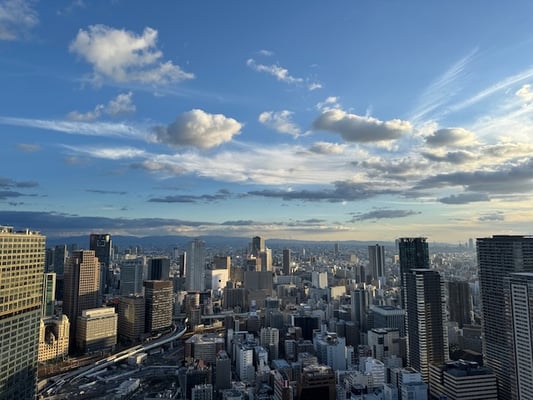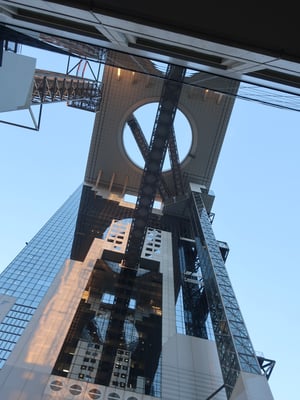 Also - wir starten mit Koyama-san zum Umeda Sky Building, nur 2 Zugstationen entfernt. Das 173m hohe Gebäude besteht aus 2 Türmen, die oben mit einen Sky Garden verbunden sind. Ein Aussenlift und sog. gläserne Rolltreppen führen nach oben: ein wunderbarer Blick in alle Richtungen über Osaka, Wolken am Himmel und die Sonne geht auch bald unter. Das hat sich gelohnt!