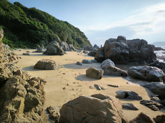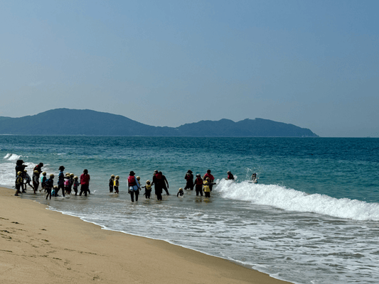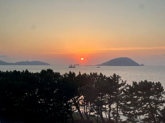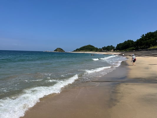 Es ist ein weiterer strahlender Tag. Wie auch schon bisher, läuft bei dieser Reise Alles wie am Schnürchen: Nach „Reistäschchen“-Frühstück um 9:30, ab 10:20 mit dem ersten Zug zu einem nächsten, klimatisch etwas unterkühlterem. Anschließend mit Bus zu unserem Ziel, dem Kyukamura Hotel auf der Insel Shikanoshima. Hier überrascht uns ein sehr schöner Sandstrand mit ebensolchem Meeresrauschen. Bis zum Beziehen unserer Zimmer und Besuch des Hotel eigenem Onsen noch ein kleiner, feiner Happen in einer noch kleineren Strandbar. Wo wir mehrfach beteuern dürfen, nicht mit dem Rad unterwegs zu sein, andern falls hätten wir wahrscheinlich das erfrischende Asahi Bier nicht serviert bekommen (ich frage mich, ob das auch gegolten hätte, wären wir mit dem Auto unterwegs gewesen?!). Am späteren Nachmittag geht es nochmals an den Strand zum Planschen und Lesen. Kurz vor dem Abendessen noch ein toller Sunset. Das Buffet bietet reichlich unterschiedlichste Arten an Meeresbewohnern - alles sehr lecker. Ein Dank an die Reiseleitung, die uns viele Biere und Sake sponsert. Der Tag klingt in der Lobby fröhlich aus. Last but not least oder anders gesagt, das Wichtigste am heutigen Tag: Karin hat Geburtstag.