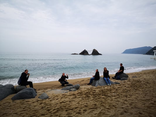 Da wir ja so lange nicht mehr am Meer waren (hust hust) haben wir uns heute zu sechst auf den Weg zur Küste von Itoshima gemacht. Erstes Ziel ist hier Sakurai Futamigaura mit einem Schrein am Meer.