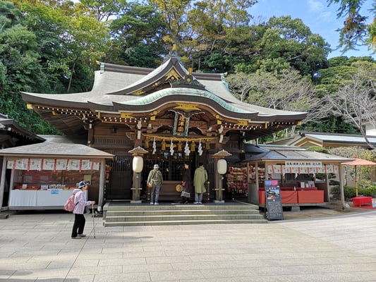 Um halb neun machte ich mich auf, bei schönstem Wetter, über unsere Haus und Hof U-Bahn (Asakusa line). 2 Stationen nach Higashi-Nihombashi. Von dort aus den Schildern folgen Richtung Shinyuku Linie und sobald sie auftauchen den Schildern für die Soubu Line (JO im blauen Quadrat). Je nach dem welchen Zug man dann erwischt, kann man sitzen bleiben, die Bahn wird dann zu Yokusuka Linie, oder man muss, wie ich, einmal noch umsteigen. Mit der Yokusuka Line fährt man dann bis Kamakura Station durch. Man kommt auch an Yokohama Station vorbei, falls man dort mal Sightseeing betreiben will. Am JR Bahnhof Kamakura angekommen habe ich auf die bekannte Enoden Line gewechselt. Man kann bis Enoshima auch mit einer JR Line fahren, aber schöner ist die Enoden Line. Diese fährt gemächlich in der Nähe der Küste und hat Haltestellen auch am Hase-dera für die Besuche der bekannten buddhistischen Tempel und Anlagen. Die kenne ich aber schon, weshalb ich heute in der Bahn bleibe bis Enoshima.