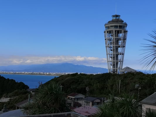 Heute habe ich mich von der Gruppe abgesetzt und mich auf den Weg nach Enoshima gemacht. Wenn vielleicht nicht der Name, sollte zumindestens die Aussicht auf diese Insel den Anime- und Popkulturfans Japans bekannt sein. Diese hügelige Insel etwa 50 Kilometer südlich von Tokio ist bekannt mit dem Aussichtsturm "Sea Candle " (wohl einer der besten Spots für die Sicht auf den Fuji bei Sonnenuntergang) und den shintoistichen Anlagen des Enoshima Schreins.