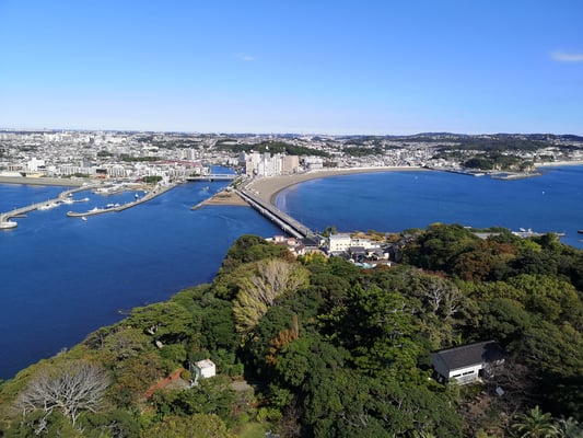 Dort geht es hinterm Bahnhof einmal um die Ecke und dann immer gerade aus Richtung Meer. Am Ende der Straße angekommen sieht man schon die Insel Enoshima. Verbunden ist die Insel zum Festland mit