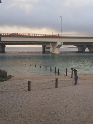 Nach ca. 35 Kilometern sahen wir dann schon vom Bus aus die mit Shinto-Seilen verbundenen Felsen im Meer. Also raus aus dem Bus und.... einen Aschenbecher gesichtet. Also erst mal Zigarettenpause und "Händewaschen". Dann aber runter zum Strand und Fotosession vom weißen Tori und den o.g. Felsen. Von links, von vorne, von rechts, mit uns dazwischen und ohne. Sehr schön und auf jeden Fall einen Stop wert. Anschließend noch am kleinen Strand entlang mit Sicht auf Palm Beach (Nein, nicht das in den USA :)). Kurz haben wir überlegt den Schrein auch zu besuchen, aber der lag steil den Berg hinauf, was nicht so einladend war, und die Mücken am Strand verfolgten uns schon. Also doch lieber zur Bushaltestelle zurück um den nächsten lokalen Bus zum nächsten Ziel zu nehmen.