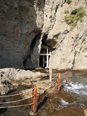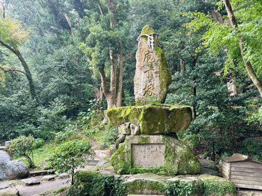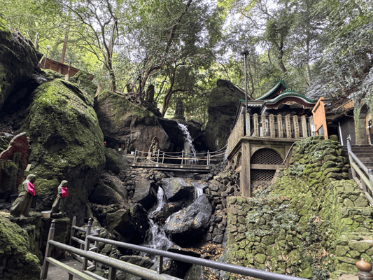 Pfad, der steil bergauf verlief. Der mühsame Aufstieg wurde mit dem Fund einer kleinen, versteckten Höhle belohnt, in der sich ein Shintō-Schrein befand. In dieser abgeschiedenen Ecke, weit