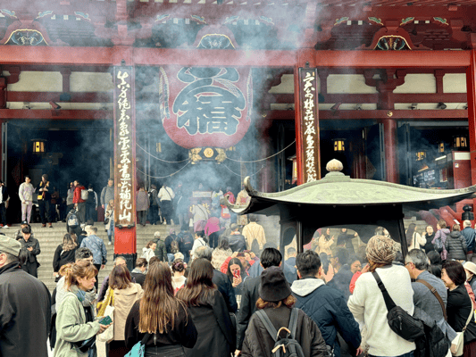 Anschließend haben wir Asakusa erkundet, mit einem Spaziergang am Fluss Richtung Asahi Brauerei und Blick auf den Tokyo Sky Tree. Ich liebe den Kannon-Tempel mit seiner quierligen Allee voll kleiner Lädchen und schlendernden Touristen im Kimono. Natürlich wurde für eine glückliche Reise ohne Unfälle und Krankheiten gebetet, bevor wir uns die Kneipenstrassen angesehen und zumindest einige noch den Blick auf den Tempel oben von der Touristeninfo aus, genossen haben.