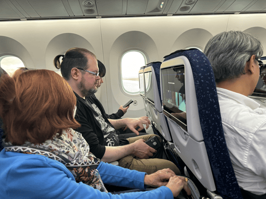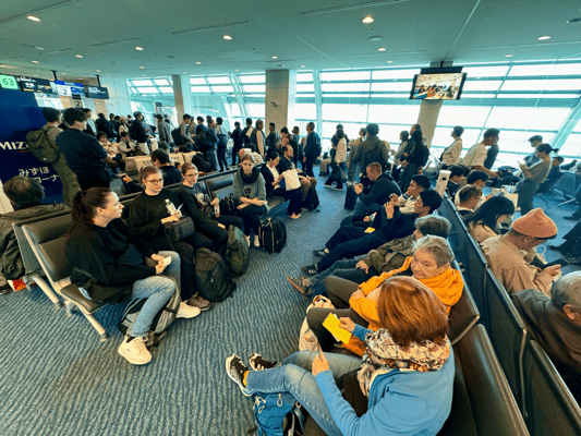 Nach einem langen Flug ohne besondere Vorkommnisse sind wir endlich in Tokyo gelandet. Die Grenzformalitäten waren für mich neu, mein WLAN funktionierte nicht und an der Zollstation fand ein Hund meinen Rucksack interessant, Schuld waren vermutlich die Äpfel, die ich im Flugzeug gegessen hatte. Obst und Gemüse dürfen nun mal nicht eingeführt werden. Nur Geduld, und zum Schluss waren wir an der „Pasmo-Station“ alle versammelt und ausgestattet für unsere 3/4 h Fahrt zum Hotel. Auch hier haben sich die Formalitäten hingezogen. Entschädigt hat uns dann ein leckeres japanisches Mittagessen nahe beim Hotel.